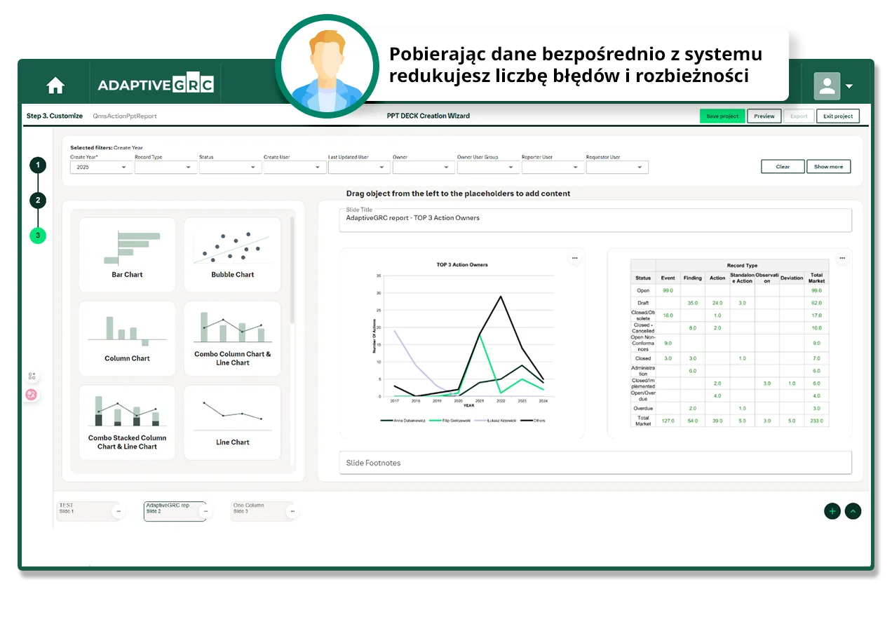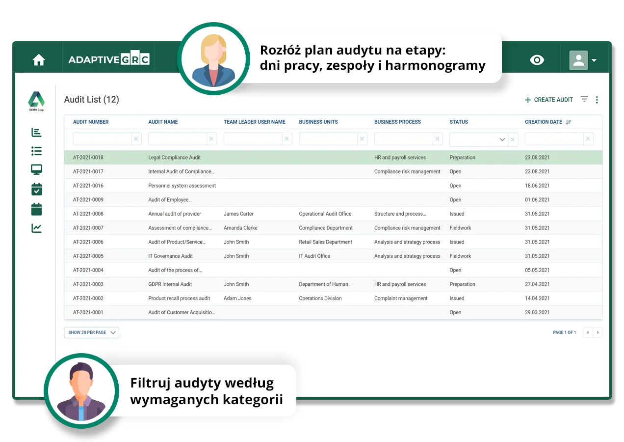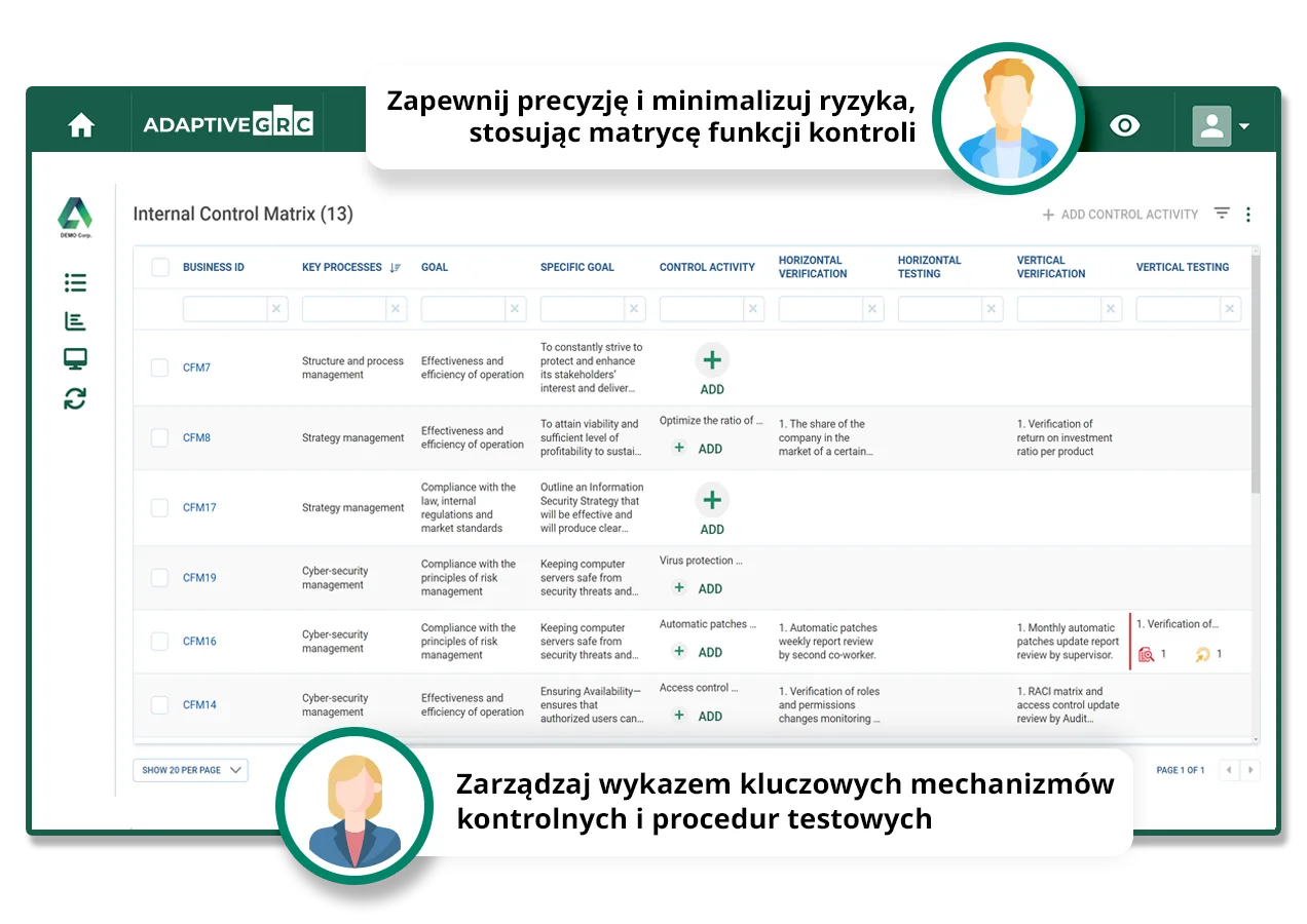 Postaw na zintegrowany system do zarządzania GRC (Governance, Risk, Compliance). Zoptymalizuj procesy zarządzania ryzykiem i zgodnością na każdym szczeblu kierowniczym, dzięki Adaptive GRC — intuicyjnej, konfigurowalnej i działającej w czasie rzeczywistym platformie. Zminimalizuj czas poświęcany na te procesy, korzystając z zautomatyzowanego przepływu pracy.