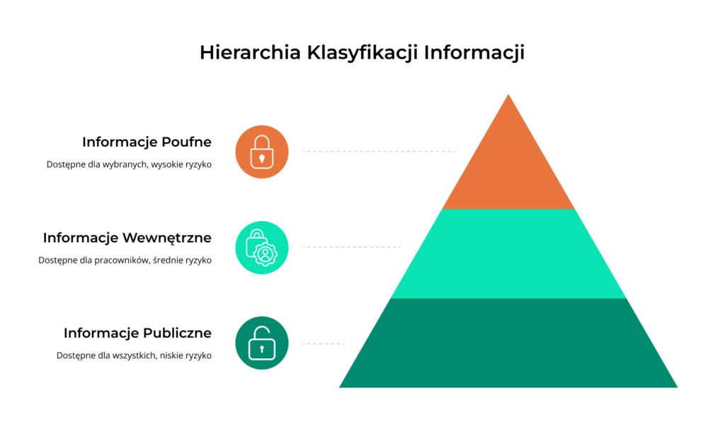 Kolejnym elementem jest klasyfikacja informacji. Organizacja powinna określić poziomy klasyfikacji, np. informacje publiczne, wewnętrzne i poufne, a następnie przypisać im zasady przechowywania i udostępniania. Klasyfikacja pomaga też w ocenie ryzyka: im wyższy poziom poufności, tym poważniejsze konsekwencje niesie nieautoryzowany dostęp i tym bardziej rygorystyczne powinny być zabezpieczenia.