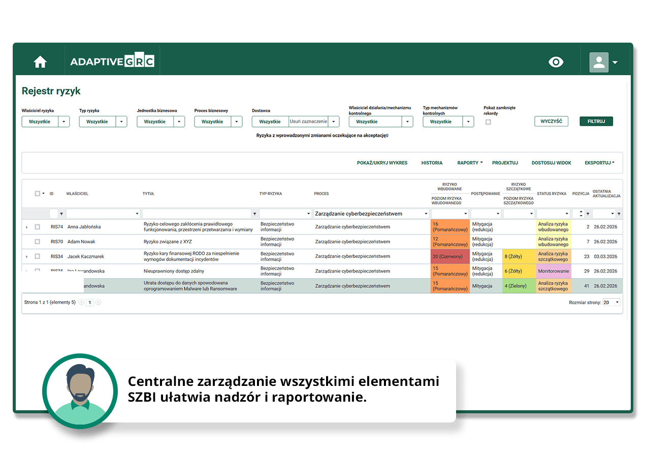Zyskaj realną kontrolę nad bezpieczeństwem informacji dzięki centralizacji wszystkich elementów SZBI w jednym, spójnym systemie. Zamiast rozproszonych plików, arkuszy i e-maili masz jedno źródło prawdy, które ułatwia nadzór, przyspiesza raportowanie i zwiększa przejrzystość działań. Wbudowane mechanizmy zarządzania ryzykiem wspierają Cię na każdym etapie – od identyfikacji i oceny zagrożeń, po ich bieżące monitorowanie. Dzięki temu szybciej podejmujesz świadome decyzje, minimalizujesz ryzyko incydentów i budujesz odporność organizacji na zagrożenia.
