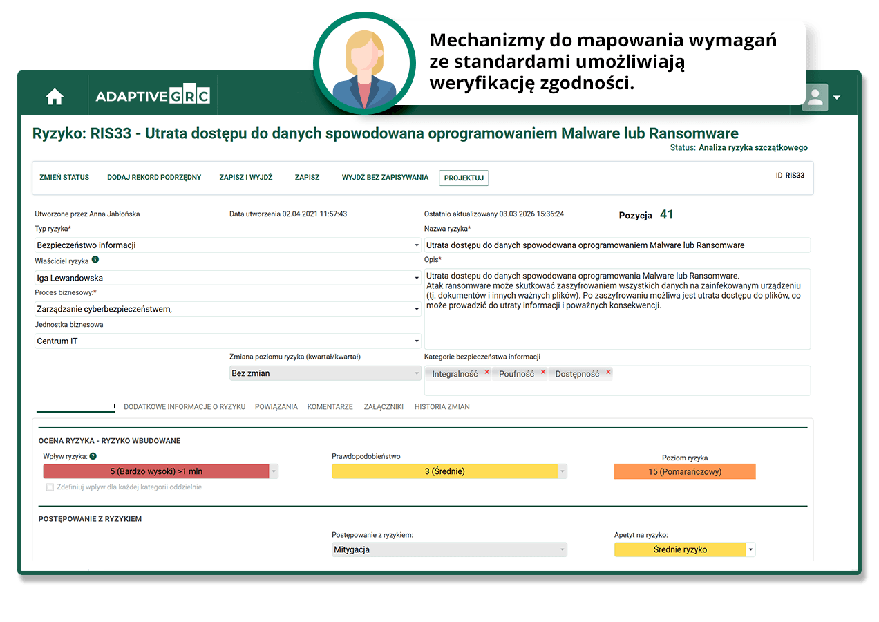 Zapewnij swojej organizacji pełną zgodność z normami takimi jak ISO 27001, dzięki wbudowanym mechanizmom mapowania wymagań i wsparciu w audytach oraz kontroli drugiej linii. AdaptiveGRC automatyzuje powtarzalne zadania związane z kontrolami, audytami i raportowaniem, co nie tylko oszczędza czas, ale też minimalizuje ryzyko błędów. Dzięki temu Twoje procesy są bardziej spójne, audyty prostsze, a zgodność z regulacjami w pełni pod kontrolą.