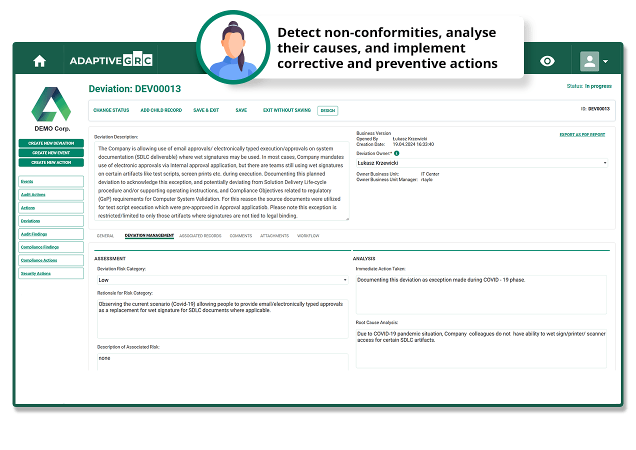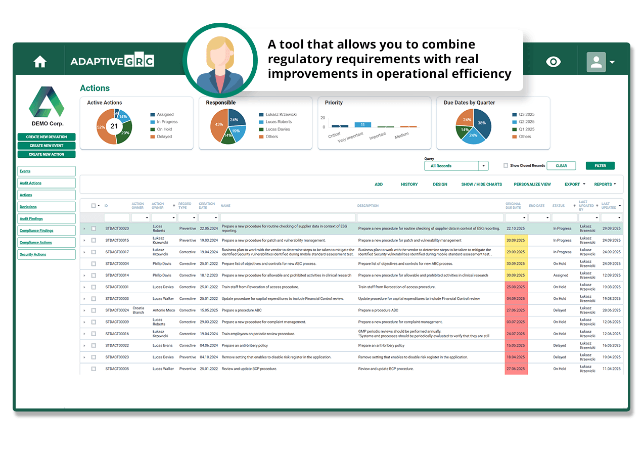 AdaptiveGRC QMS helps organisations reduce operational risk through automatic reminders, email notifications, and timeliness-tracking. Tasks stay on schedule, and the impact of corrective and preventive measures is easy to evaluate. QMS combines regulatory compliance with measurable gains in operational efficiency.
