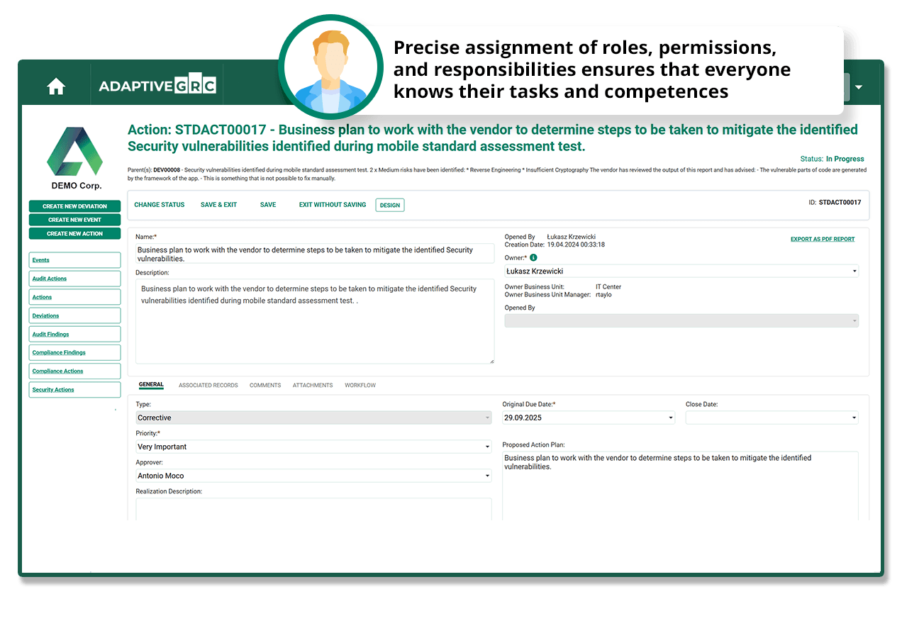 AdaptiveGRC QMS ensures clear roles, permissions, and responsibilities, so everyone knows what they own. Custom workflows for records, such as events or nonconformities, make processes transparent and controlled end to end.